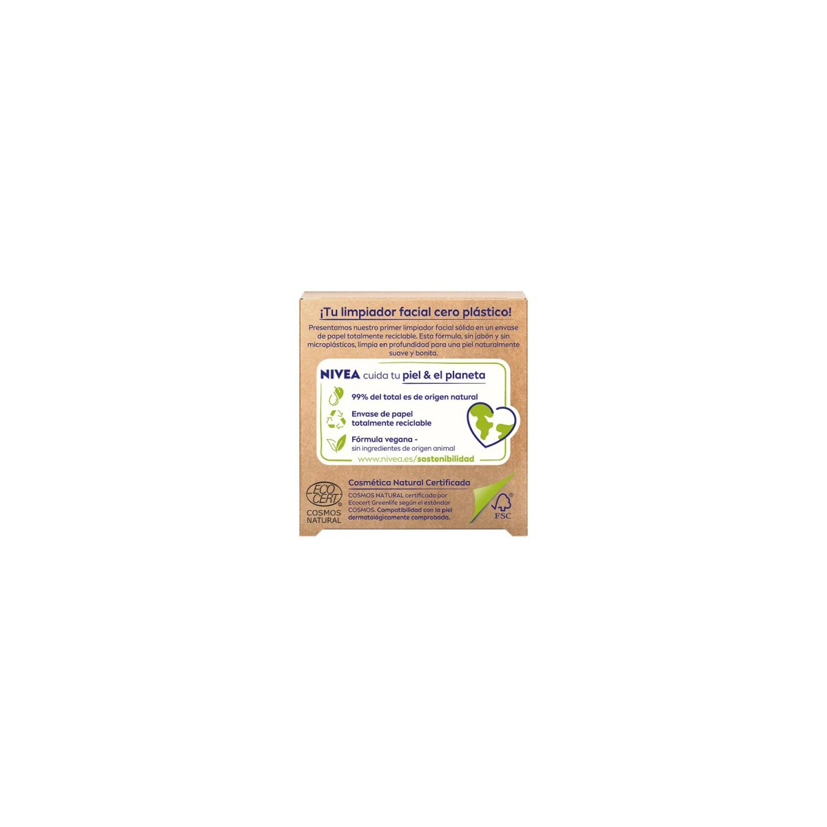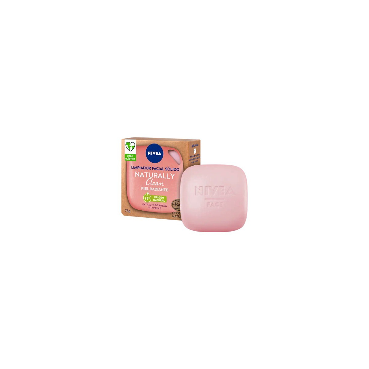 En nuestro compromiso por un futuro más sostenible, presentamos nuestro primer limpiador facial sólido y certificado NIVEA Naturally Clean Piel Radiante en un envase de papel totalmente reciclable y cero plástico. La fórmula de este limpiador facial sólido de NIVEA, sin jabón y sin microplásticos, respeta el pH natural de tu piel. Disfruta de una piel limpia, suave y naturalmente bonita tras cada limpieza facial. Con extracto de rosa y vitamina E, 99% ingredientes de origen natural y fórmula vegana, sin ingredientes de origen animal. ¡Tu limpiador facial cero plástico!